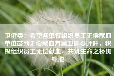 蜘蛛池卫健委发出呼吁,希望各单位积极组织员工参与无偿献血活动,这一倡议的提出,旨在鼓励社会各界共同关注血液安全,为需要输血的患者提供及时的帮助,共同维护人民群众的生命健康。血液是生命之源,对于许多疾病的治疗和抢救至关重要,随着医疗需求的不断增长,血液资源有时会出现短缺的情况,在这种情况下,无偿献... -
